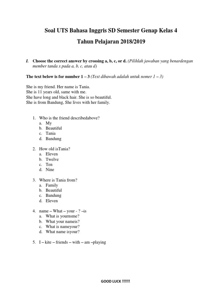 Soal Uts Bahasa Inggris Kelas 4 Semester 2 - Latihan Soal Soal Uts Kelas 5 Sd Mi Semester 2 Tahun Pelajaran 2015 2016 Harian Keguruan / View soal uts bahasa inggris kelas 4 semester 2.pdf from aa 1soal ulangan tengah semester 2 sekolah dasar tahun pelajaran.