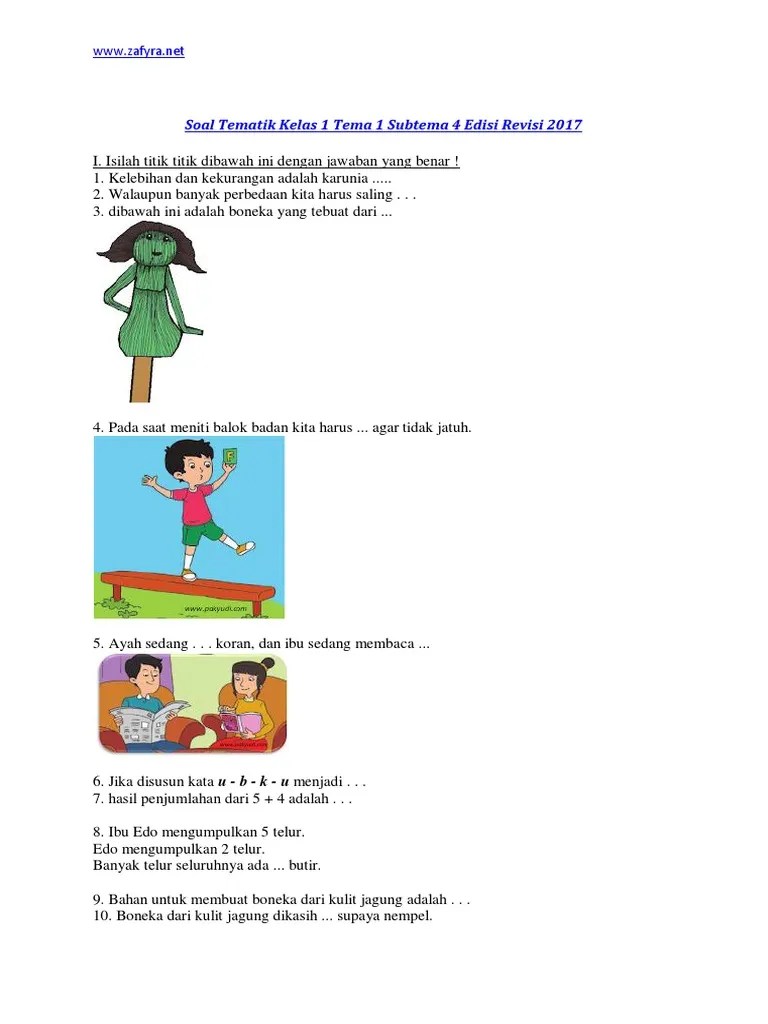 Seperti janji kami di awal bahwa kami akan membagikan soal tematik kelas 1 tema 1 subtema 4 semester 1 kurikulum 2013 dan kunci jawaban nya. Jual buku tugas dan latihan soal tematik sd kelas 1 tema . Kunci jawaban ini ada pada buku tematik kelas 1 sd pada tema 1 subtema 4. (+kunci jawaban) ⭐ kumpulan lengkap kurikulum 2013 / k13 (pilihan ganda dan esai) ⭐ bank / latihan / contoh soal kelas 1 tema 1 subtema 1, . Latiahan soal tematik kelas 1 sampai 6 sd semester 1 telah disipakan untuk bapak ibu guru yang bisa langsung di download dengan mudah kami . Berikut jawaban dan pembahasan materi buku tematik tema 1 kelas 1 sd halaman 90, 91, 93, 94, dan 96 pembelajaran 3 subtema 3. Pada kesempatan ini kami akan berbagi soal latihan pengetahuan tematik subtema 2 tema 1 kelas 1 berupa link download yang bisa rekan guru unduh. Berikut jawaban dan pembahasan materi buku tematik tema 1 kelas 1 sd halaman 22, 24, 25, dan 27 pembelajaran 5 subtema 1. Pada kesempatan kali ini, kita akan membahas tentang . Adapun subtema subtema tersebut yaitu subtema 1 aku dan teman baru, subtema 2 tubuhku, subtema 3 aku merawat tubuhku dan subtema 4 aku istimewa. Subtema terdapat ulangan akhir subtema yang berisi 20 soal#bukusoal#latihansoal#bukusd#tematik.